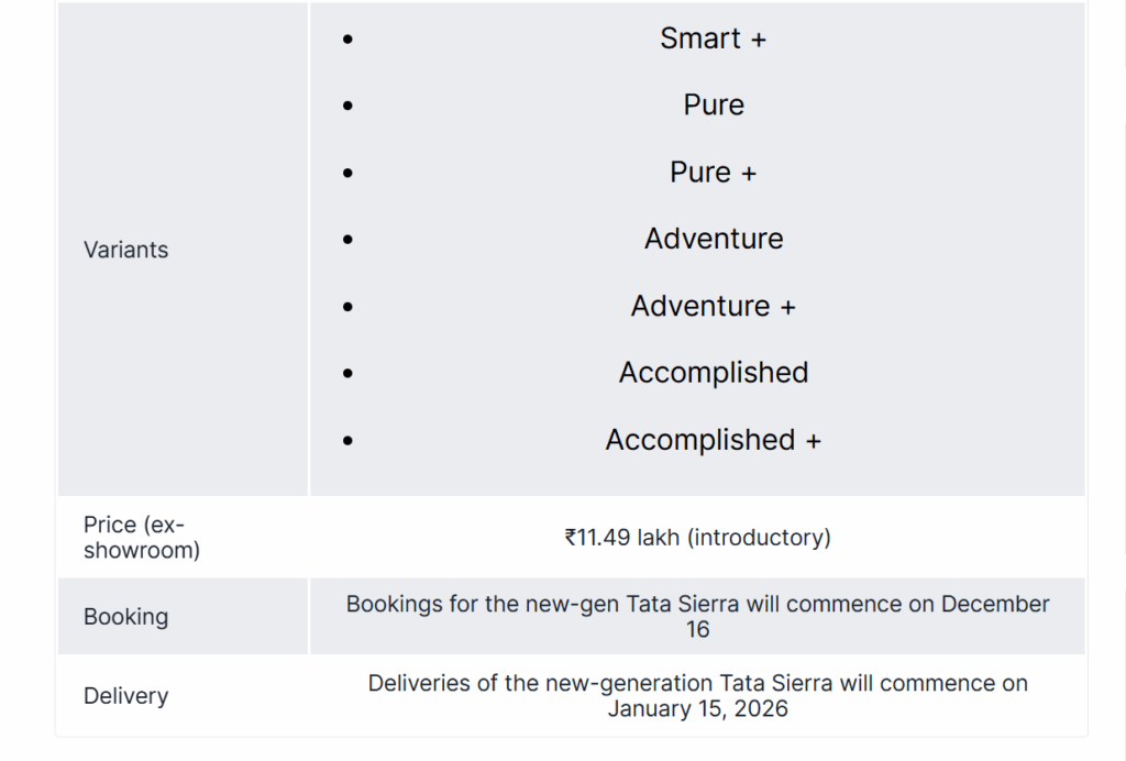 इसके अलावा, Tata Sierra कम से कम पांच फीचर्स और एक पावरट्रेन के साथ आती है जो किसी भी Tata car के लिए पहली बार है। इनमें SUV के टॉप-एंड ट्रिम में उपलब्ध ट्रिपल-स्क्रीन सेटअप शामिल है, जिसमें 12.3-inch सेंटर टचस्क्रीन, 12.3-inch पैसेंजर टचस्क्रीन और 10.25-inch डिजिटल ड्राइवर डिस्प्ले शामिल है। इसमें साउंडबार, एक्सटेंडेड सन वाइज़र, एडजस्टेबल फ्रंट Under-thigh सपोर्ट और Auxiliary taillight के साथ 12-स्पीकर JBL ऑडियो सिस्टम भी शामिल है। Sierra में 17 mm bi-LED हेडलैंप हैं, जो इंडियन मार्किट में सबसे पतले हैं, जबकि इसका पैनोरमिक सनरूफ मार्किट में सबसे बड़ा है।